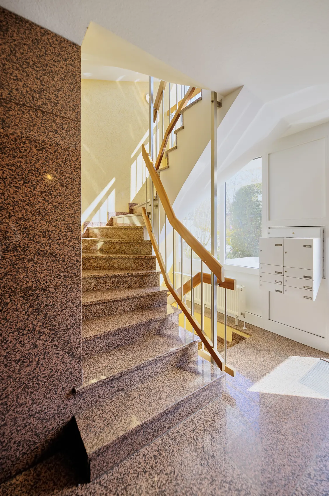 Die Ausstattung entspricht einem soliden mittleren Standard: Parkettböden, isolierverglaste Fenster, teilweise offene Kamine sowie Balkone und Terrassen. Die Erdgeschosseinheit verfügt über drei größere Terrassen bzw. Gartenbezug und eröffnet perspektivisch auch eine Eigennutzungsoption mit paralleler Vermietung der übrigen Einheiten.
